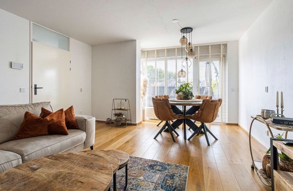 Woonkamer: De lichte, tuingerichte woonkamer heeft grote raampartijen en een extra raam aan de achterzijde, waardoor er volop natuurlijk licht binnenvalt. Via een loopdeur heeft u toegang tot de zonnige tuin, en een deur leidt naar de bijkeuken met wasmachineaansluiting en toegang tot het achterpad. De woonkamer is afgewerkt met een eikenhouten vloer en strak gestucte wanden.