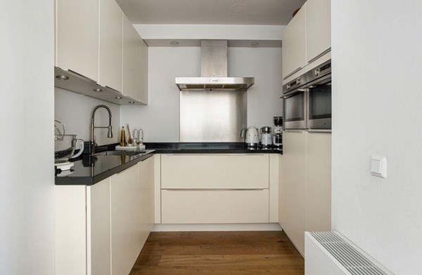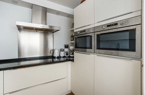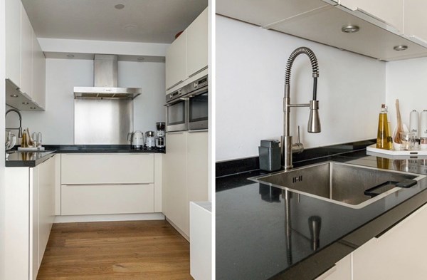 Keuken: De open keuken in U-opstelling is modern en luxe uitgevoerd. Voorzien van een koelkast, vriezer, twee combimagnetrons, een inductiekookplaat, en een wit design met een zwart werkblad.