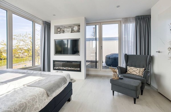Slaapkamer III: Royale, lichte slaapkamer met toegang tot het dakterras op het westen. Uitgerust met een vaste schuifkastenwand.