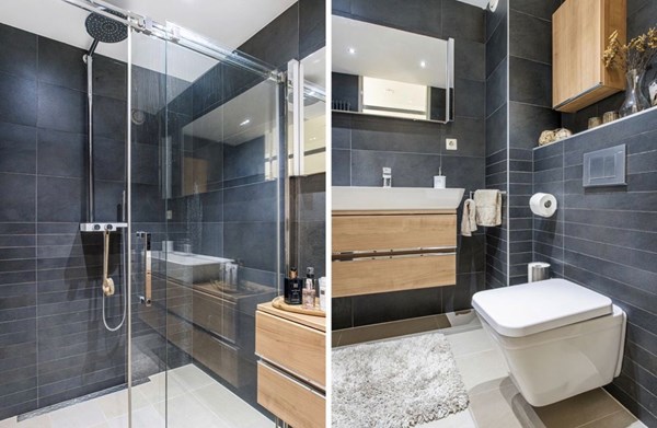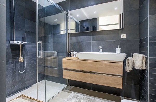 Badkamer: Luxe en moderne badkamer met een inloopdouche met regendouche, designwastafel met wandmeubel en spiegel, hangcloset, designradiator, en een verlaagd plafond met inbouwspotjes. De badkamer is volledig betegeld in antraciet en zandtinten.