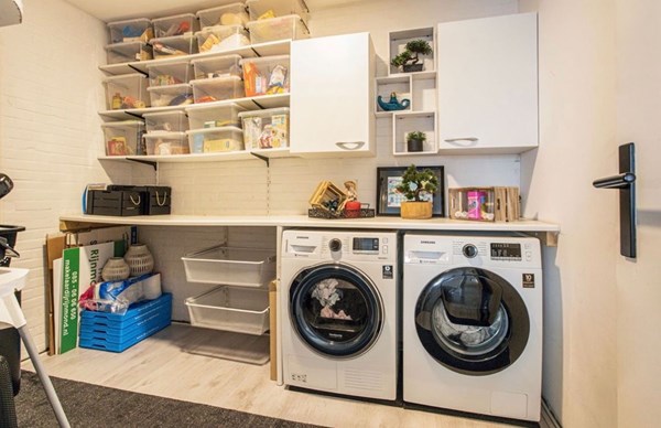 Technische ruimte: Hier bevinden zich de CV-combiketel, aansluitingen voor wasmachine en droger, en de mechanische ventilatie-unit. De verdieping is afgewerkt met een laminaatvloer en strak afgewerkte wanden.