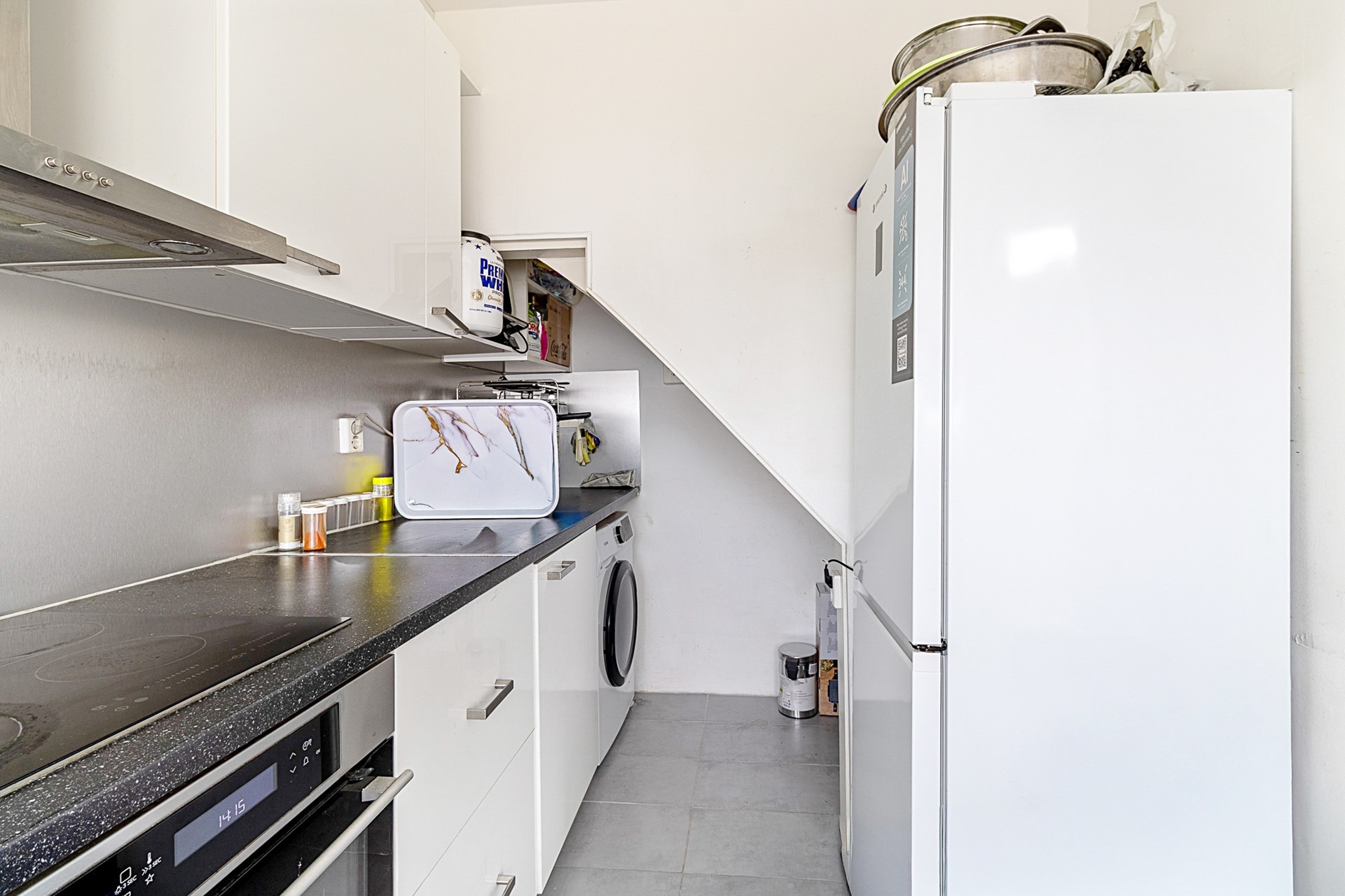 De royale woonkamer is licht en voorzien van een nette laminaatvloer. De keuken is praktisch ingericht en uitgerust met een keramische kookplaat en afzuigkap. Tevens bevinden zich hier de wasmachineaansluiting.