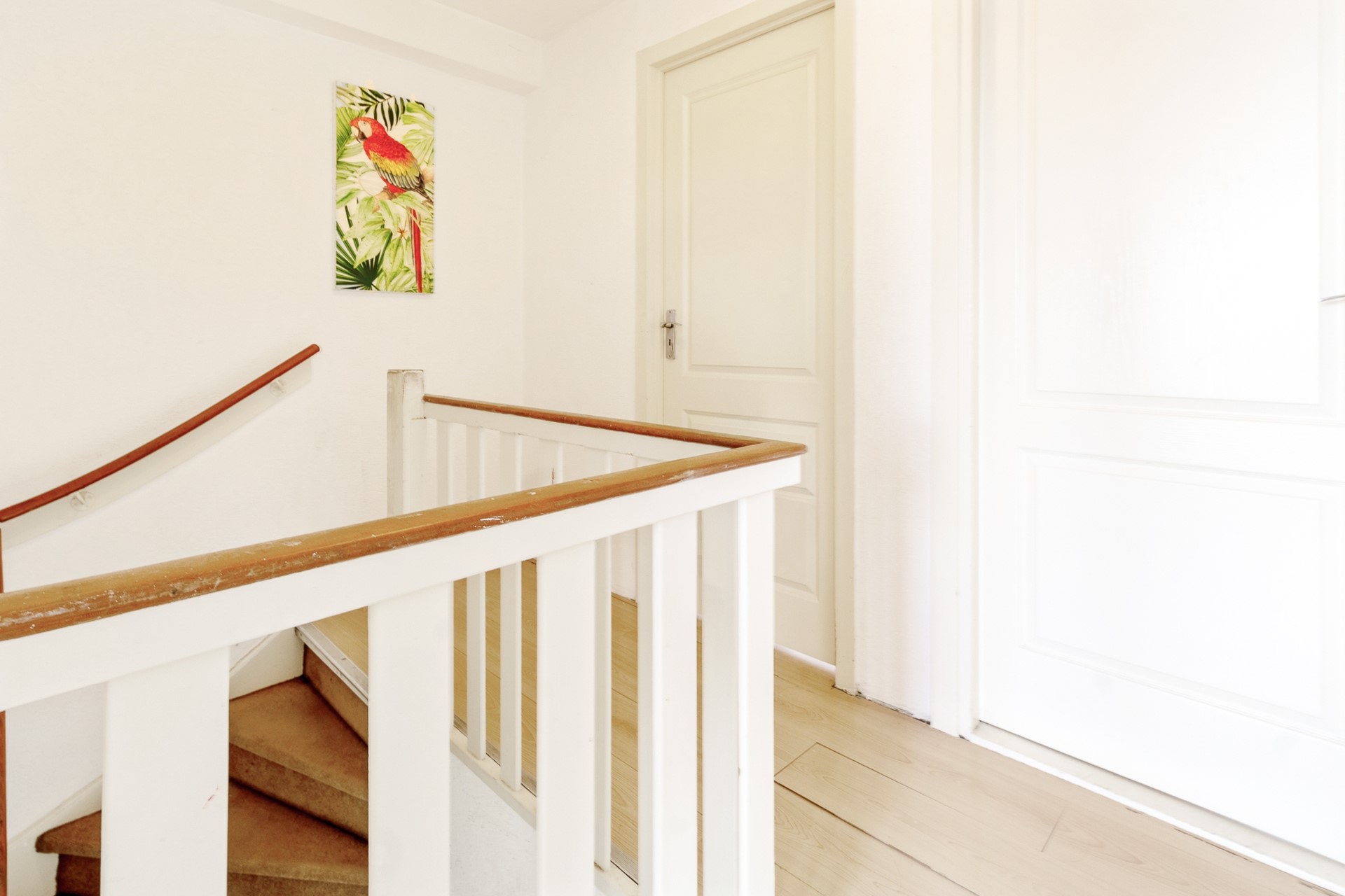 Overloop met toegang tot drie goed bemeten slaapkamers en de badkamer. Alle slaapkamers zijn afgewerkt met een verzorgde laminaatvloer.